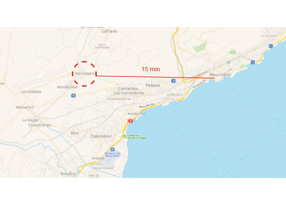 Montmollin se situe à environ 15 minutes du centre de Neuchâtel en voiture.